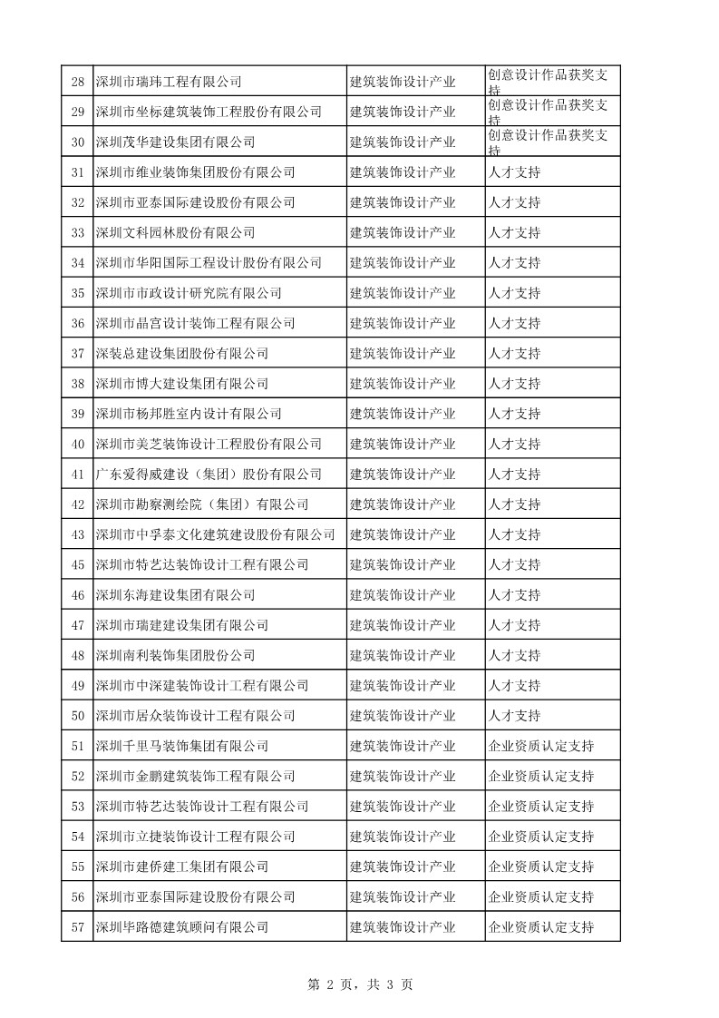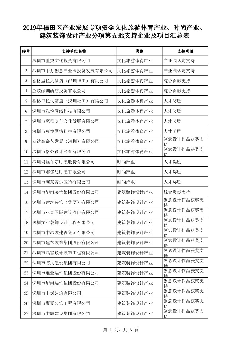 核心提示:2019年12月11日,福田企服中心公布了2019年福田區(qū)產(chǎn)業(yè)發(fā)展專項資金文化旅游體育產(chǎn)業(yè)、時尚產(chǎn)業(yè)、建筑裝飾設(shè)計產(chǎn)業(yè)分項第五批支持企業(yè)及項目匯總表。其中,深圳市華南裝飾集團股份有限公司、深圳市亞泰國際建設(shè)股份有限公司、深圳文業(yè)裝飾設(shè)計工程有限公司、深圳市維業(yè)裝飾集團股份有限公司等建筑裝飾設(shè)計企業(yè)獲得該項資金支持,支持項目類別有綜合貢獻支持、創(chuàng)意設(shè)計作品獲獎支持、人才支持、企業(yè)資質(zhì)認定支持。
