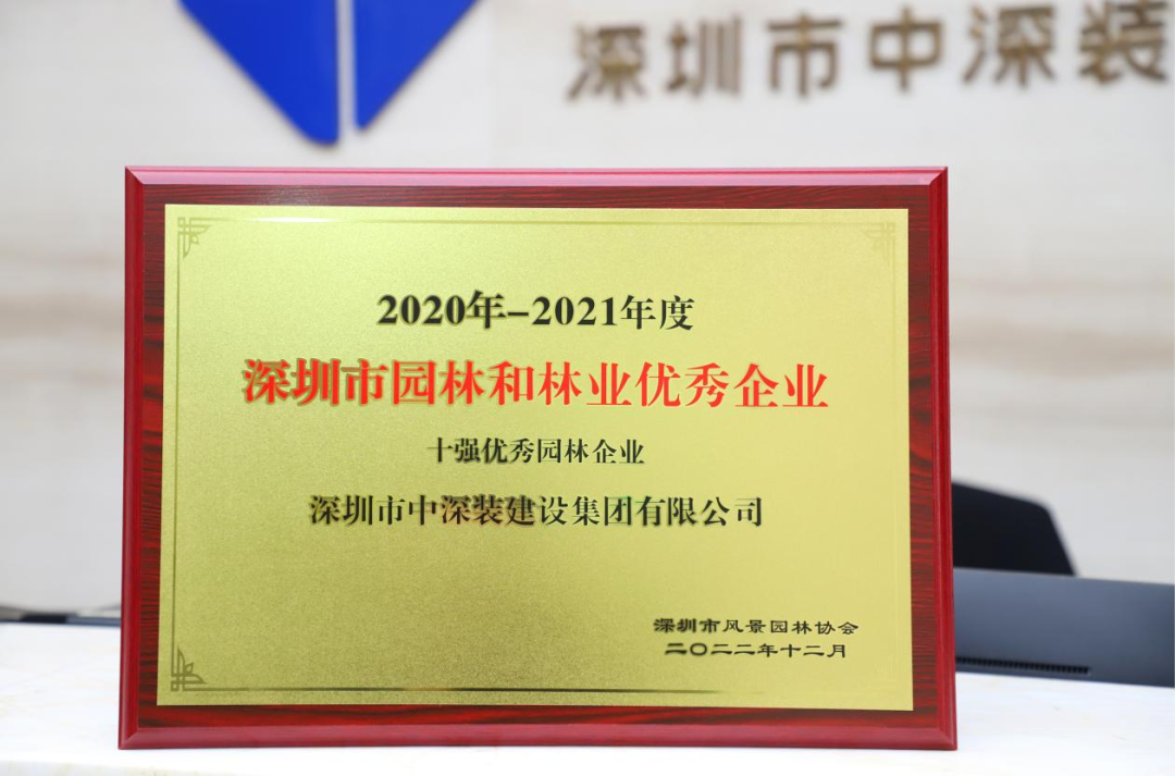 近日,中深裝集團收到深圳市風景園林協會頒發的“2020-2021年度深圳市園林和林業優秀企業”榮譽證書和牌匾,按照評選規則,評優總分位列前10名被授予“深圳市十強優秀園林企業”稱號,中深裝集團位列其中,此次獲獎,也是中深裝集團繼2010年獲評該稱號以來連續十一年獲此殊榮。