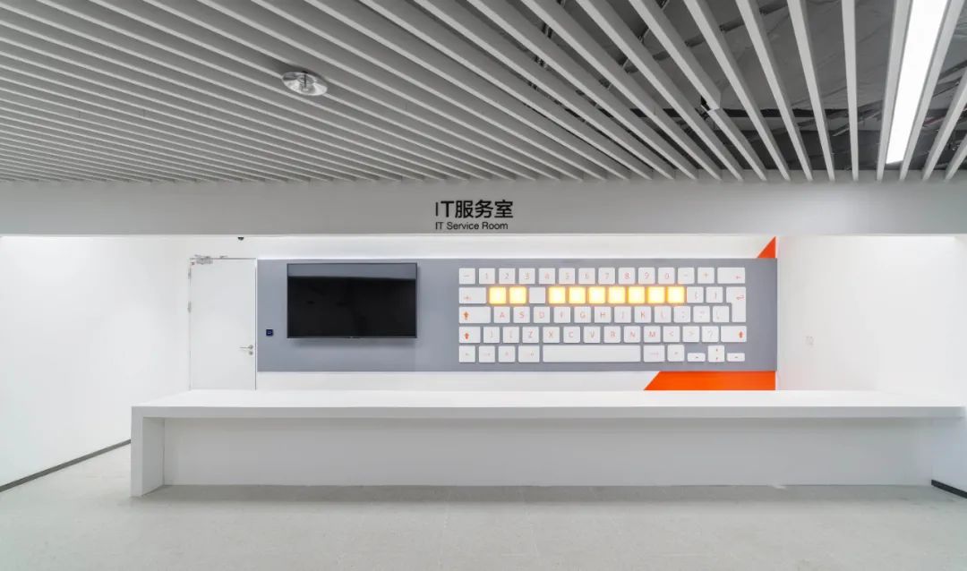 天花采用鋁方通格柵吊頂和開放式原頂噴涂,增加了平面導(dǎo)向性,提升了天花空間,降低了多種裝飾材料堆積造成的空氣污染,營造綠色環(huán)保的辦公環(huán)境。