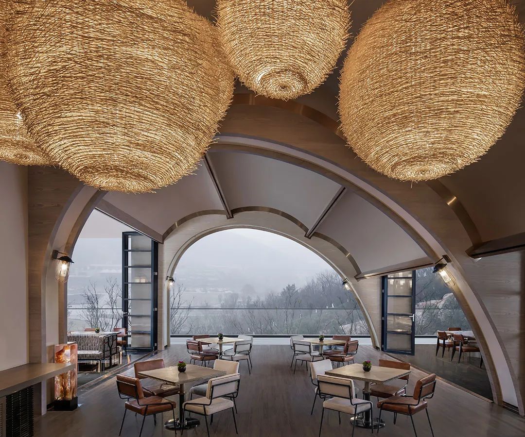 全日餐廳則以營地帳篷為靈感,挑出高闊的弧形穹隆,直面百丈崖壁。幾何型家具使空間大量留白,令人豪氣頓生,不禁對飲浩曠天地,坐觀霧橫湯山。