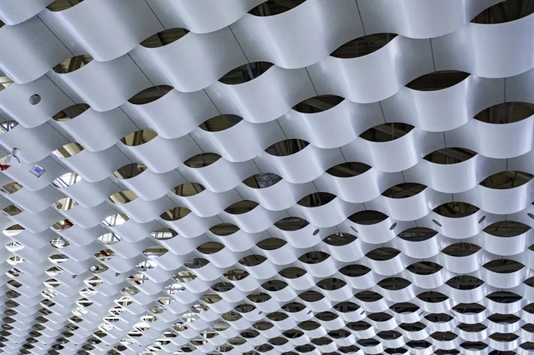 整個主登錄廳最具特色的當屬那50米高空處由1976塊波浪形蜂窩鋁板組成的波浪吊頂。因此,主登錄廳成為了整個項目精裝修工程中高空頂面最大、施工難度最大、工藝最復雜的標段。