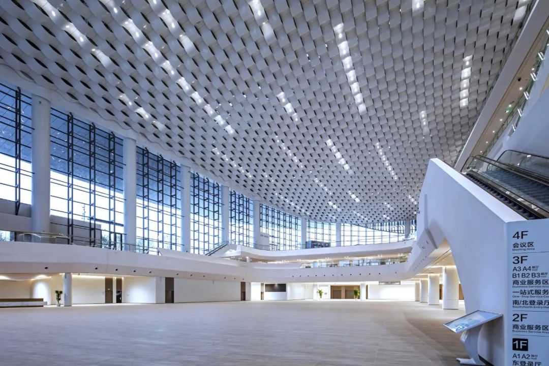 走進門廳,一股簡潔明快、清新大方的現代之風撲面而來。站在高大寬闊的大廳前,人顯得如此渺小。放眼望去,無論是那充滿海浪流動感的四層樓裙,還是那連綿起伏、波瀾涌動的波浪形吊頂,亦或是那鑲嵌在波浪之中宛如明珠般的點點燈光,都讓人有一種身臨浩瀚大海之感。主登錄廳也是整個會展中心最具特色、最核心、最重要的區域之一。