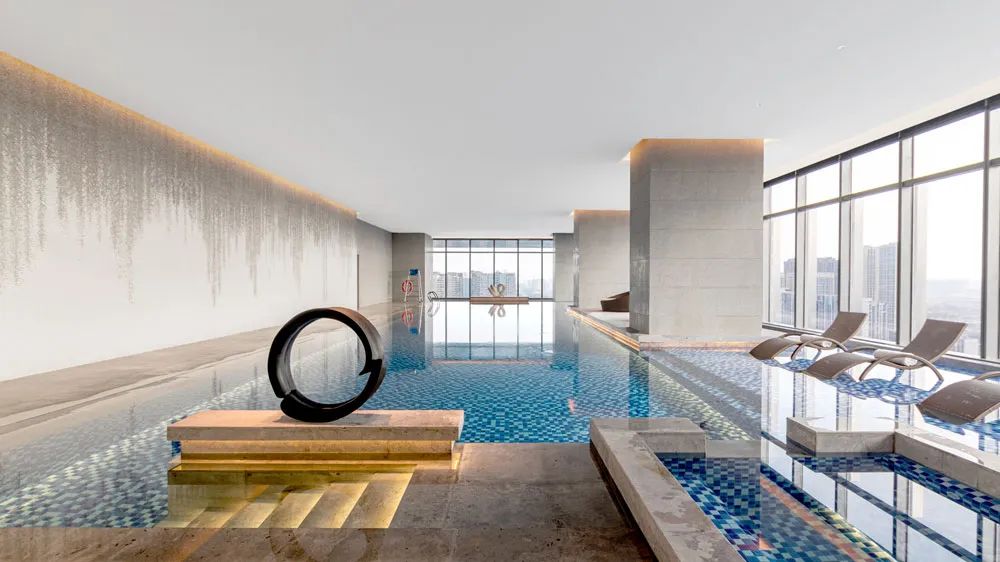位于18層的養生中心以“庭院下溫暖的夜光”為靈感,在600㎡的空間中將山之自然,水之靜謐化作空間意境,300㎡的云端無邊際恒溫泳池讓賓客仿佛置身于“雨下的庭院”。