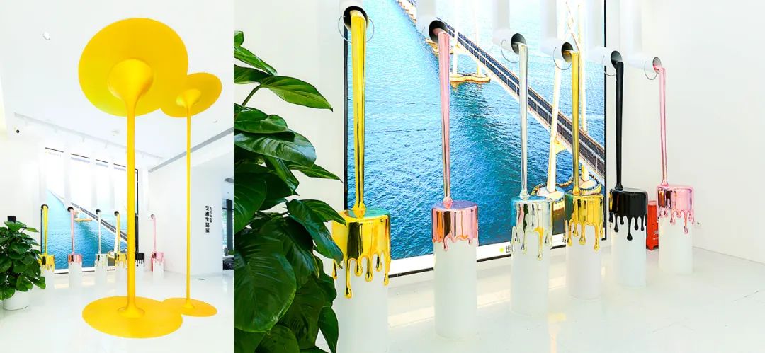 以鋁材和厚石塊作為地面裝置,吊裝成懸浮的體系。在往上漂浮的過程中原石逐漸過渡為鋁材,意在用意象的方式傳達給觀眾企業(yè)本身生產材料與方式。