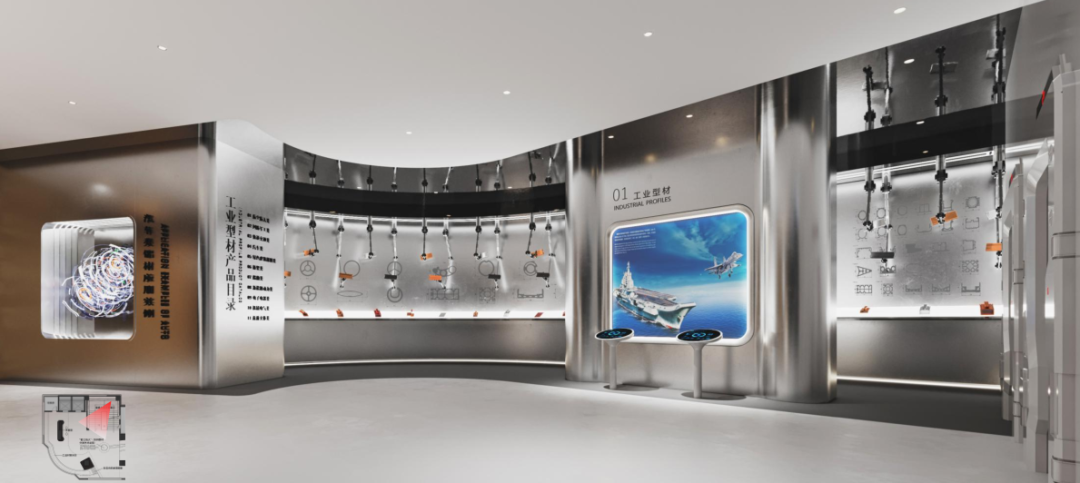 企業(yè)成長是必定經歷種種坎坷的,猶如一段“歷天火而開天地”的涅槃艱辛過程。道路上方由火光躍動的LED屏幕與裂開的天花作為序章。天花側面是鋁材原材剖面藝術展現(xiàn),空間右側蝕刻著企業(yè)的大事記,展示著企業(yè)孜孜奮斗的華美篇章。