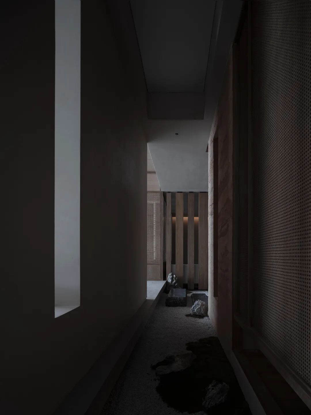 空間有時更像一座橋梁,建立起環(huán)境與人文的密切聯(lián)系。半入的微光將空間純粹化,此時的浮躁與喧囂好似無處遁形,與深邃而神秘的陰影相輔相成,構(gòu)成凝練的幾何形式感。