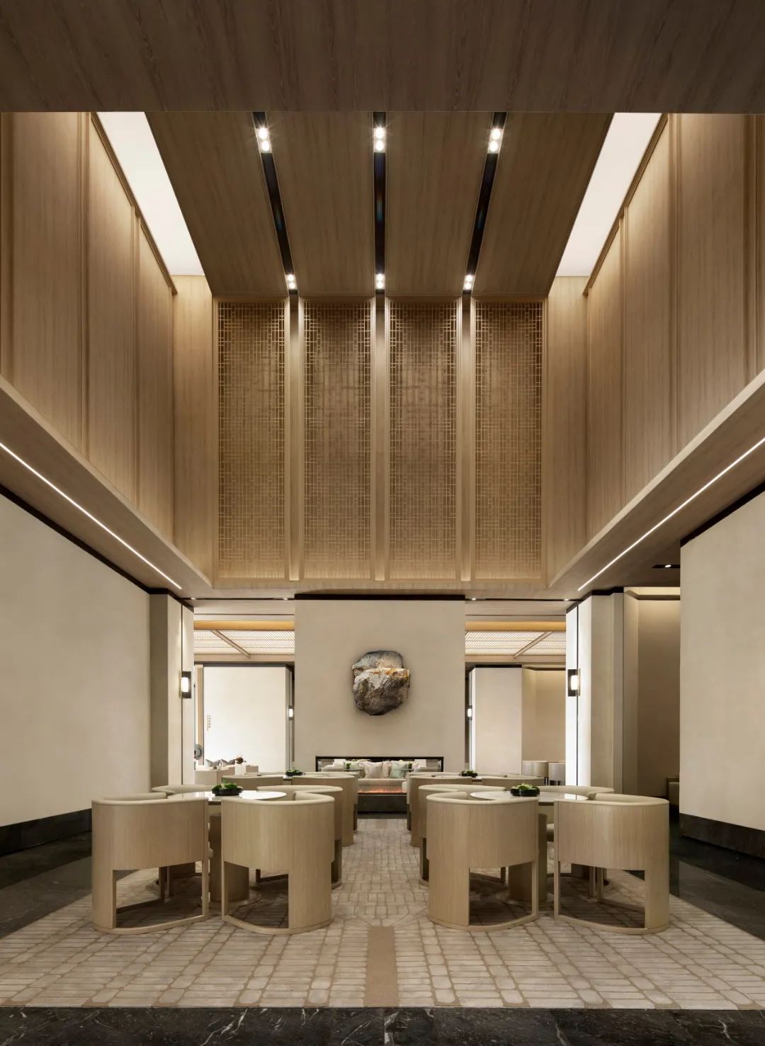 水吧區使用原木色主調,在筆直空間中穿插流線裝飾,溫潤圓弧與方正造型相得益彰。虛實空間中,感知宋代的人文雅致。墻面加入青色紋樣,為空間帶來更多通透、清涼之感,寬敞大氣又不乏別致表達,從而構成視覺上的韻律感,訴說著品質生活的追求。
