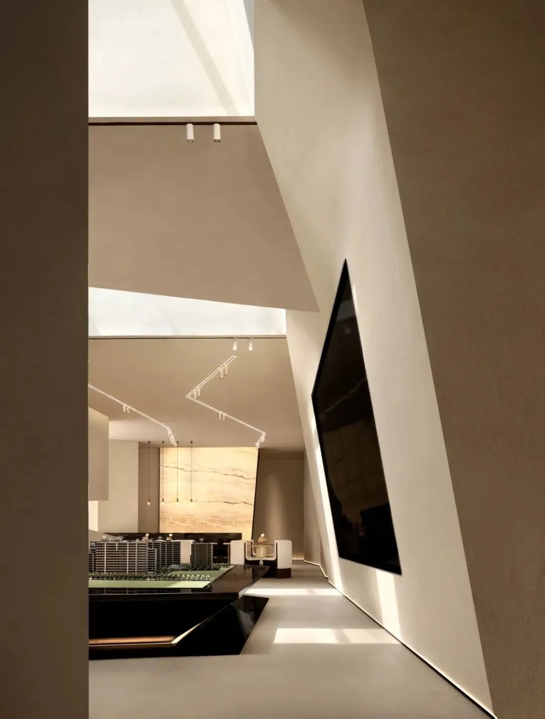 在整個生活館中,人們的體驗在氛圍、光線和質感方面的明顯差異之間取得平衡,從隱匿在山谷頂上的天光到光線充足的臨水洽談區,上升與下降,內部與外部、地面與天空或城市與自然之間的并列,喚起類似山谷游玩的相似感受。