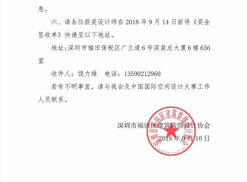 關于第八屆中國國際空間設計大賽十大杰出建筑裝飾設計師 十佳家裝設計師獎金發放流程的說明