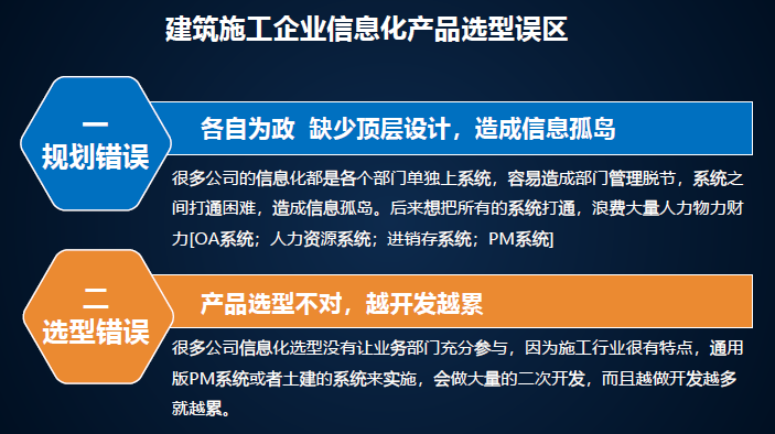 建筑施工企業(yè)信息化產(chǎn)品選型誤區(qū)。很多企業(yè)信息化又想做又害怕,我們總結(jié)了幾方面的問(wèn)題,規(guī)劃錯(cuò)誤,缺少頂層設(shè)計(jì)造成信息孤島。每一個(gè)部門買自己的。我們了解過(guò)一個(gè)企業(yè)有八套系統(tǒng),都是獨(dú)立的,最后作為領(lǐng)導(dǎo)什么數(shù)據(jù)看的都是不一樣的。產(chǎn)品先型不對(duì),越開(kāi)發(fā)越累,要懂行的才能研究出來(lái),如果找一個(gè)軟件,他什么都不懂,能給你研發(fā)出相關(guān)行業(yè)軟件嗎?不行,要選對(duì)。萬(wàn)能論、無(wú)用論,軟件不是萬(wàn)能的,也不是無(wú)用的,關(guān)鍵是怎么用。能實(shí)施好才是最主要的。對(duì)于信息化,不管花幾十萬(wàn)、幾百萬(wàn)、幾千萬(wàn),要落地,否則就打水漂了。信息化是請(qǐng)老師還是請(qǐng)學(xué)生?